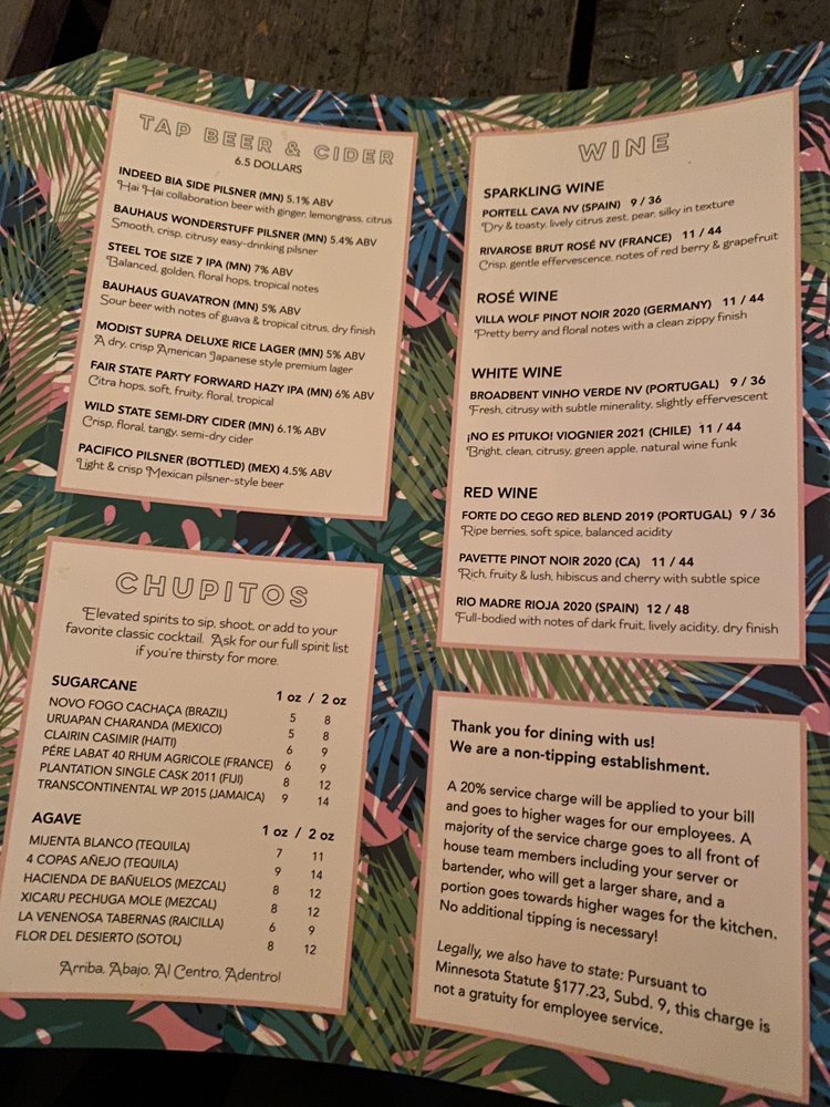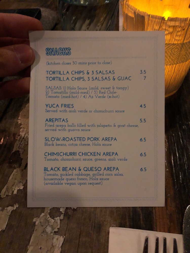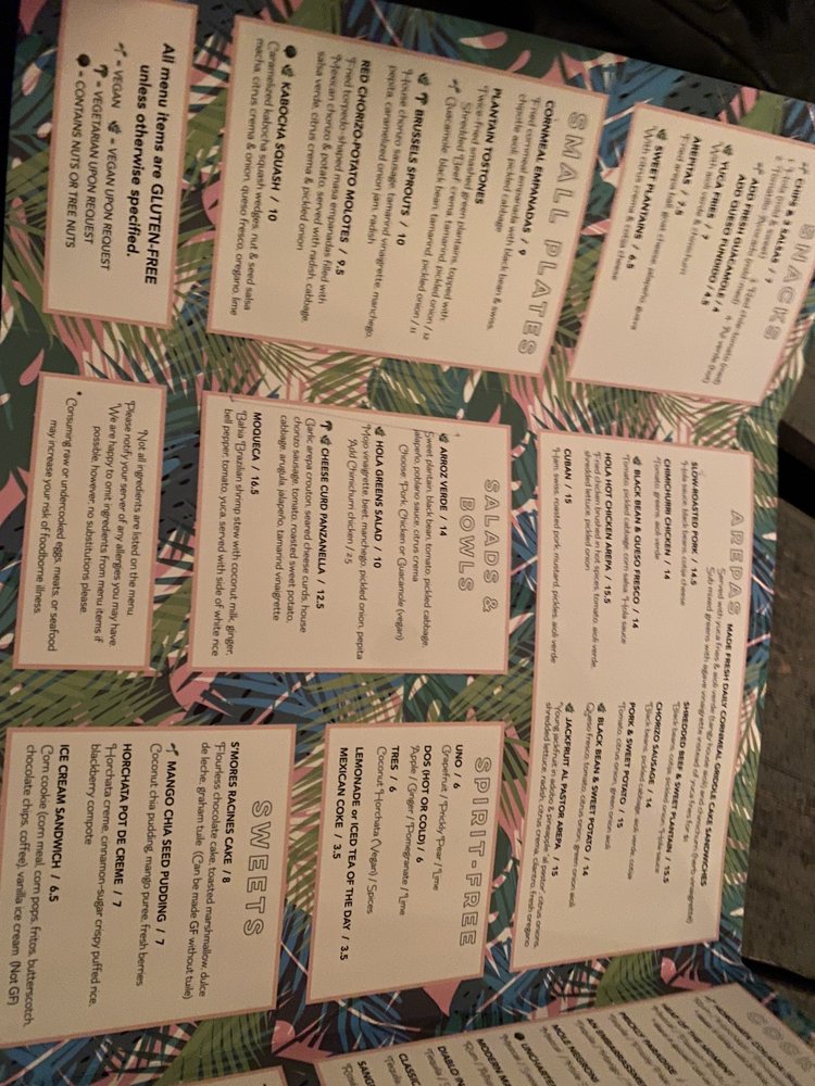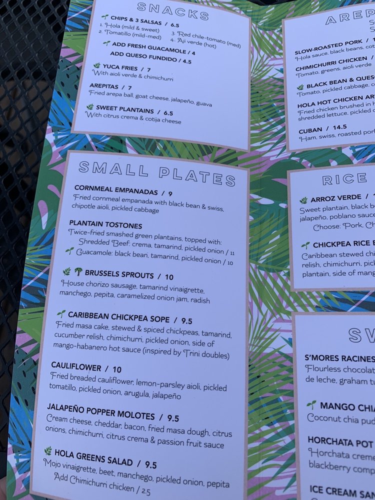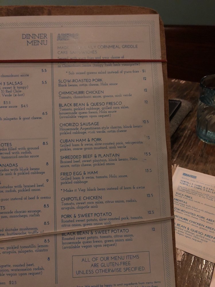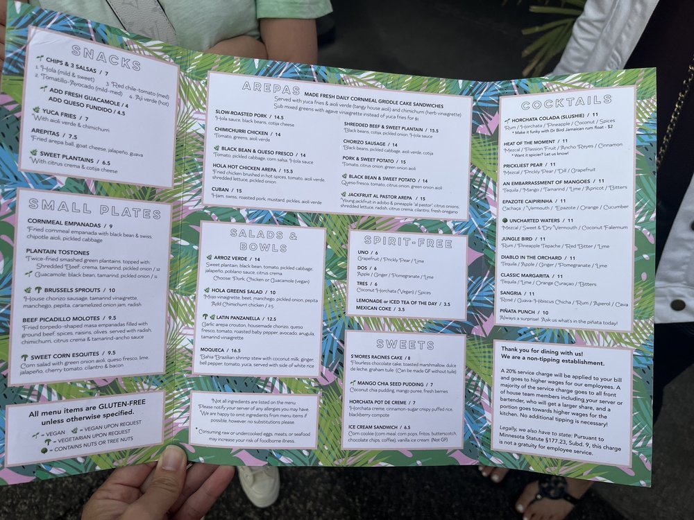 Introducing the menu at Hola Arepa, a vibrant Latin-inspired restaurant located in Minneapolis. This women-owned establishment offers a range of delicious options for vegans, vegetarians, and meat lovers alike. The menu features mouth-watering arepas like the Chalupa Arepa and Pork Belly Arepa, along with sides like yucca fries and side salads. The drink menu is equally impressive, with rotating tequila cocktails and options for beer, wine, and unique cocktails. The tropical atmosphere, covered outdoor seating, and friendly service make Hola Arepa a go-to spot for a carefree yet flavorful dining experience. Don't miss out on their hot honey chicken thighs arepa or the Cuban arepa - both are sure to leave you craving for more. Experience a taste of Latin flavor at Hola Arepa, where every dish is a culinary delight.